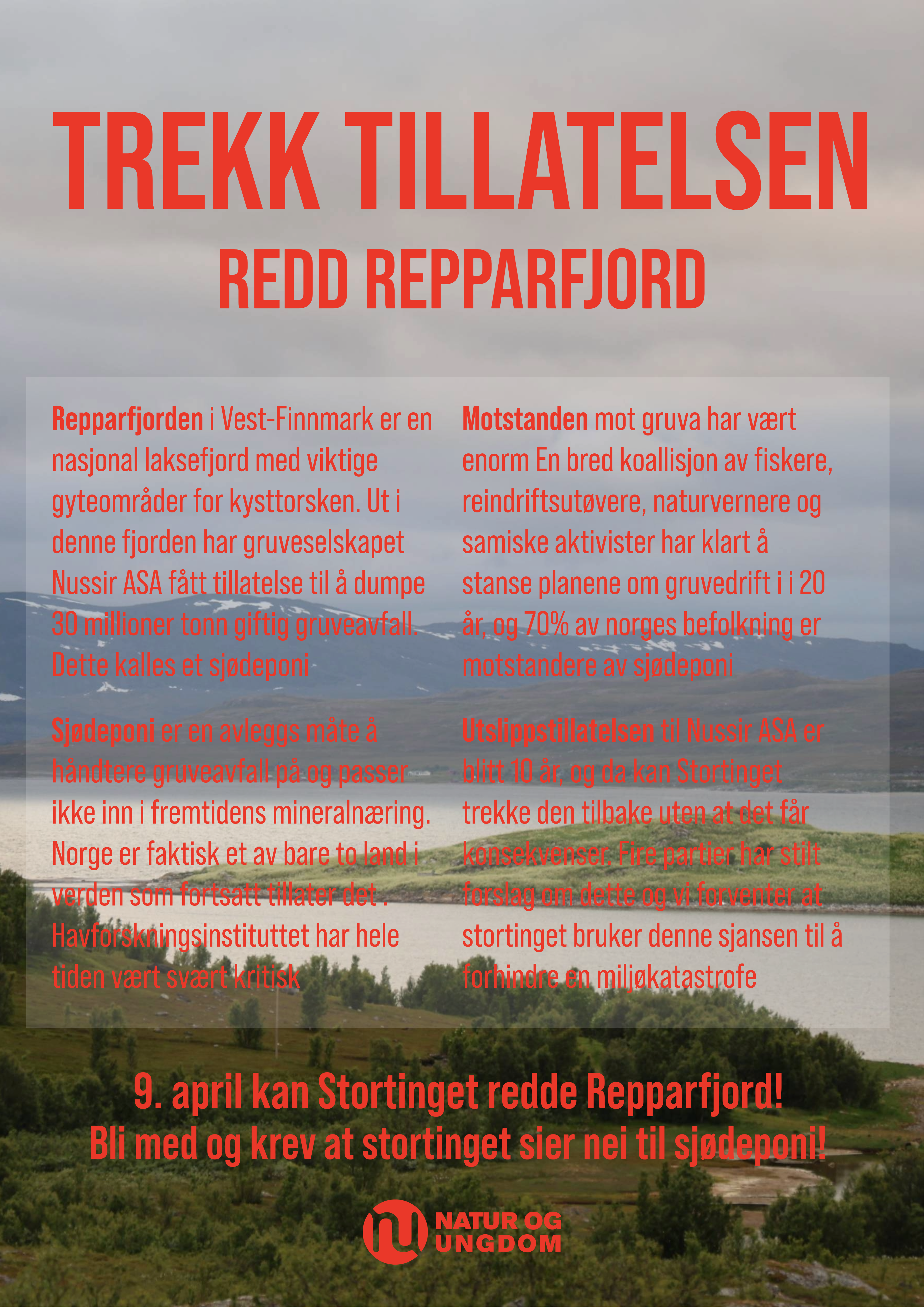 9. april skal representantforslaget om å trekke utslippstillatelsen til Nussir ASA opp i Stortinget. Om forslaget går gjennom vil det stanse gruva i Repparfjord. Vi må skape så mye oppmerksomhet som bare mulig! Her er flyere, info og aksjonsideer hvis ditt lokallag vil bli med!
